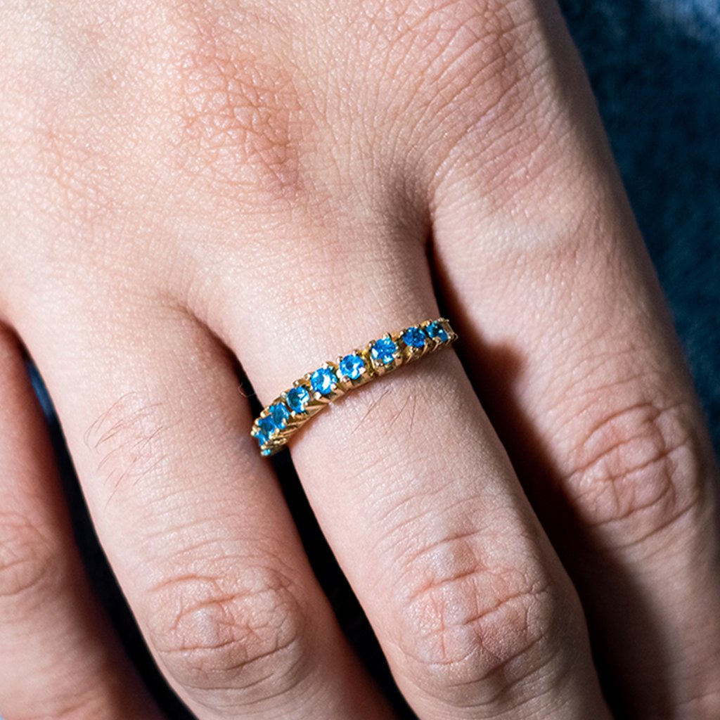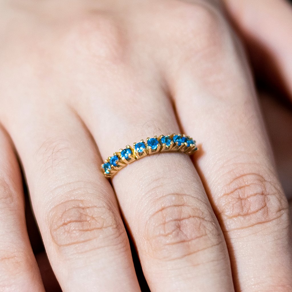 A Meia Aliança de Apatitas Natural com 9 Pedras da marca DREAMERS é um verdadeiro amuleto de proteção e conexão espiritual. Com seu design delicado e sofisticado, este acessório é perfeito para quem busca equilíbrio e tranquilidade no dia a dia. As apatitas azuis, conhecidas como pedras do ano 2022, são reconhecidas por promover a comunicação, clareza mental e fortalecer a intuição.